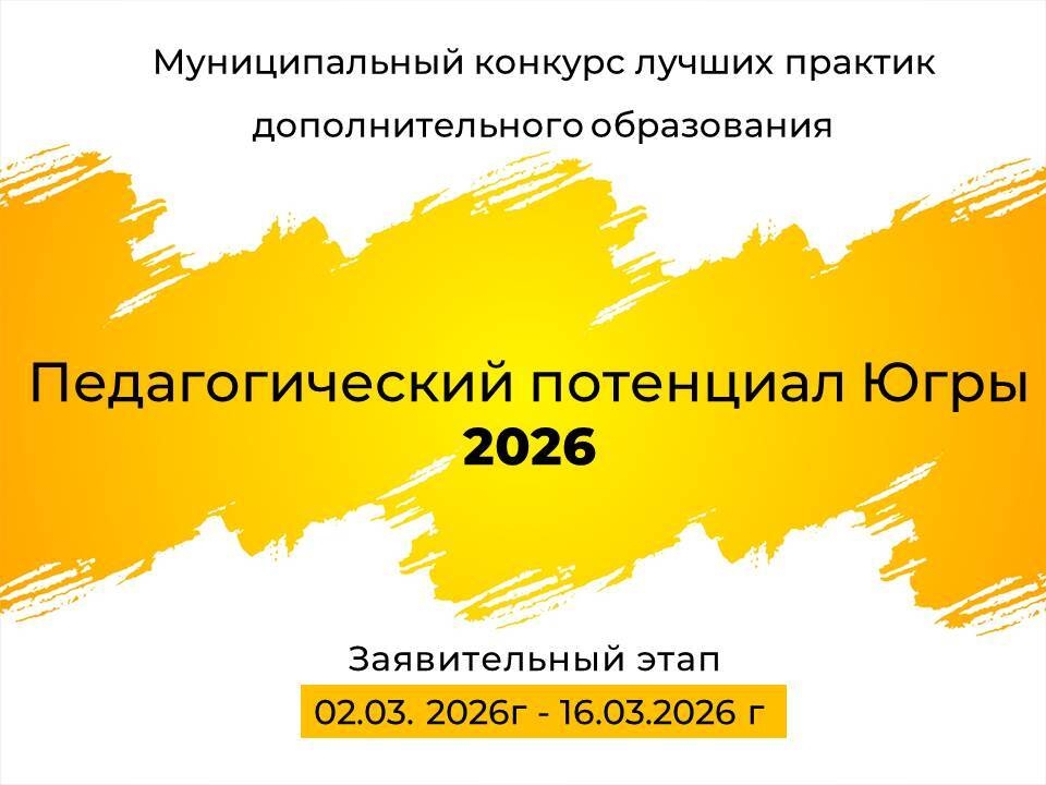 Муниципальный конкурс лучших практик дополнительного образования «Педагогический потенциал Югры-2026 Цель конкурса – выявление, распространение и поддержка в педагогическом сообществе лучших практик дополнительного образования, повышение профессиональной значимости и общественного признания деятельности педагогических работников, а также стимулирование их профессионального роста.Номинации конкурса (частично изменились в 2026 году!!!) :Практики применения современных методов и форматов обучения, направленных на развитие метапредметных навыков, навыков проектной, учебно-исследовательской деятельности, взаимное обучение.Практики реализации программ технологических кружков.Практики наставничества» (Модель наставничества «педагог - учащийся»)Практики работы с одарёнными детьми в сфере дополнительного образования. Практики работы с детьми с особыми образовательными потребностями.Практики профориентационной работы с обучающимися. Лучшая дополнительная общеразвивающая программа духовно-нравственного и гражданско-патриотического воспитания детей и молодёжи. Заявительный этап – с 02 марта 2026г по 16 марта 2026 г (включительно). Представление конкурсных работ (защита) – 19 марта 2026 г.🔗Просим внимательно ознакомиться с условиями проведения конкурса в положении!Сопровождение конкурса: муниципальный опорный центр дополнительного образования,