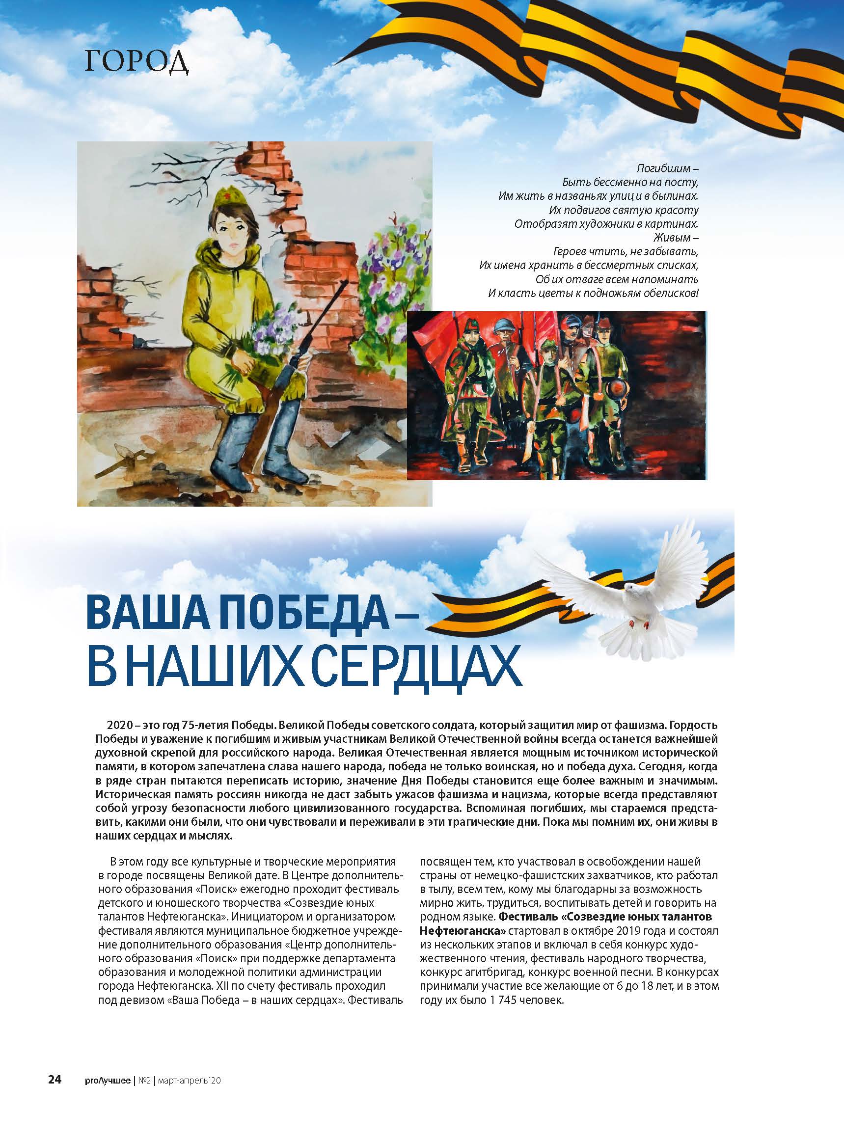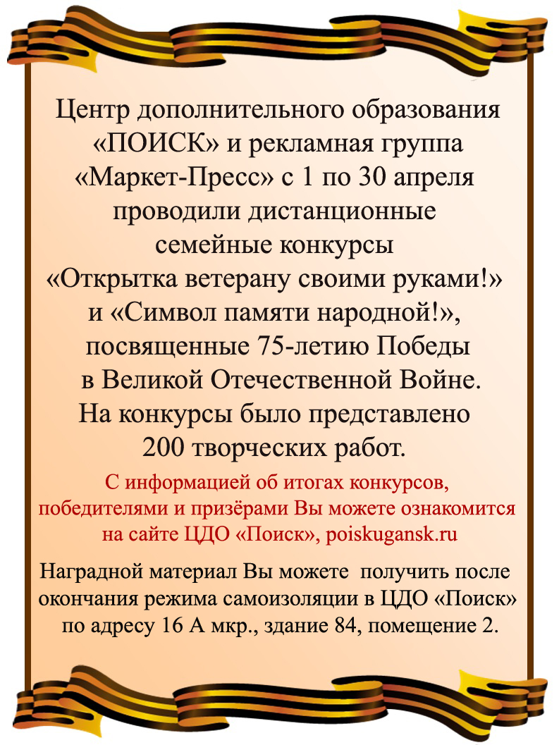 9 Мая 2020 года вся страна будет праздновать 75-летие Победы русского народа в Великой Отечественной войне. В честь празднования 75-летия Победы Центр дополнительного образования «Поиск» совместно с рекламной группой «Маркет ПРЕСС» с первого по тридцатое апреля проводил дистанционный семейный конкурс чтецов «Мы о войне стихами говорим!».