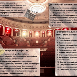 Нам рассказали о том, кто же такой актер, выявили необходимые профессиональные навыки,и конечно же, указали на достоинства и недостатки актерской профессии так что скорее читайте полезную информацию, и вперед окунаться в творчество с головой