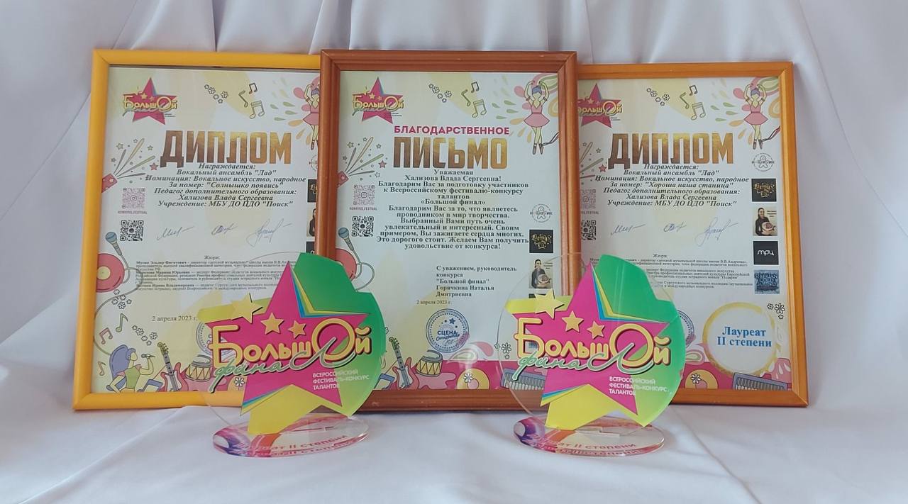 Воспитанники творческих объединений вокального ансамбля «Лад» и образцового хореографического ансамбля «Калейдоскоп» Центра дополнительного образования «Поиск» приняли участие во Всероссийском фестивале-конкурсе талантов «Большой финал», который проходил в Центре культуры и досуга «Камертон» города Сургут.