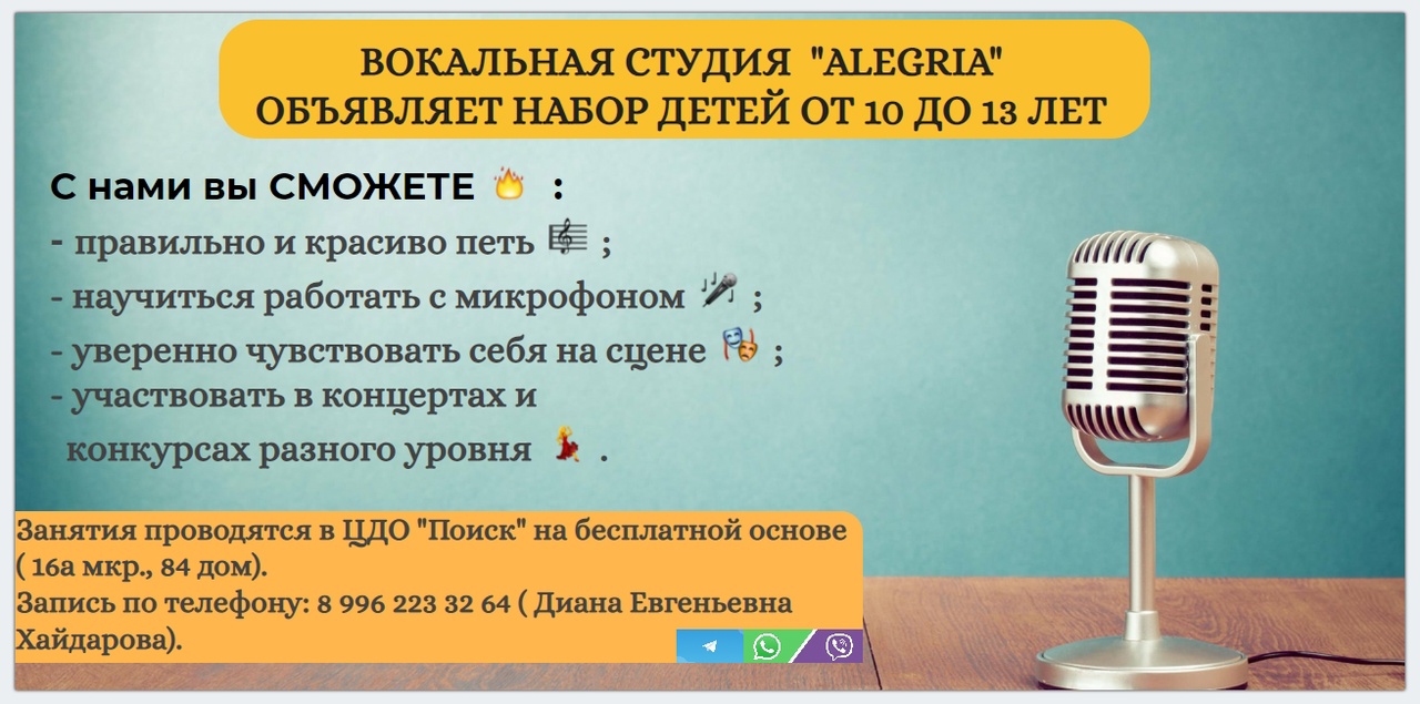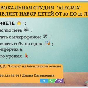 Центр дополнительного образования "Поиск" ( 16а мкр., 84 дом) объявляет набор детей от 10 до 13 лет в вокальную студию "Alegria". Занятия проводятся на бесплатной основе.