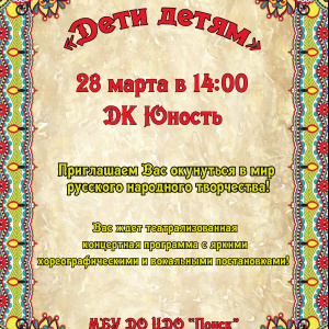 Мы с радостью приглашаем Вас на концерт, который состоится 28 мартав 14.00 ДК Юность в рамках проекта «Дети детям». Для вас выступят коллективы МБУ ДО ЦДО «Поиск».