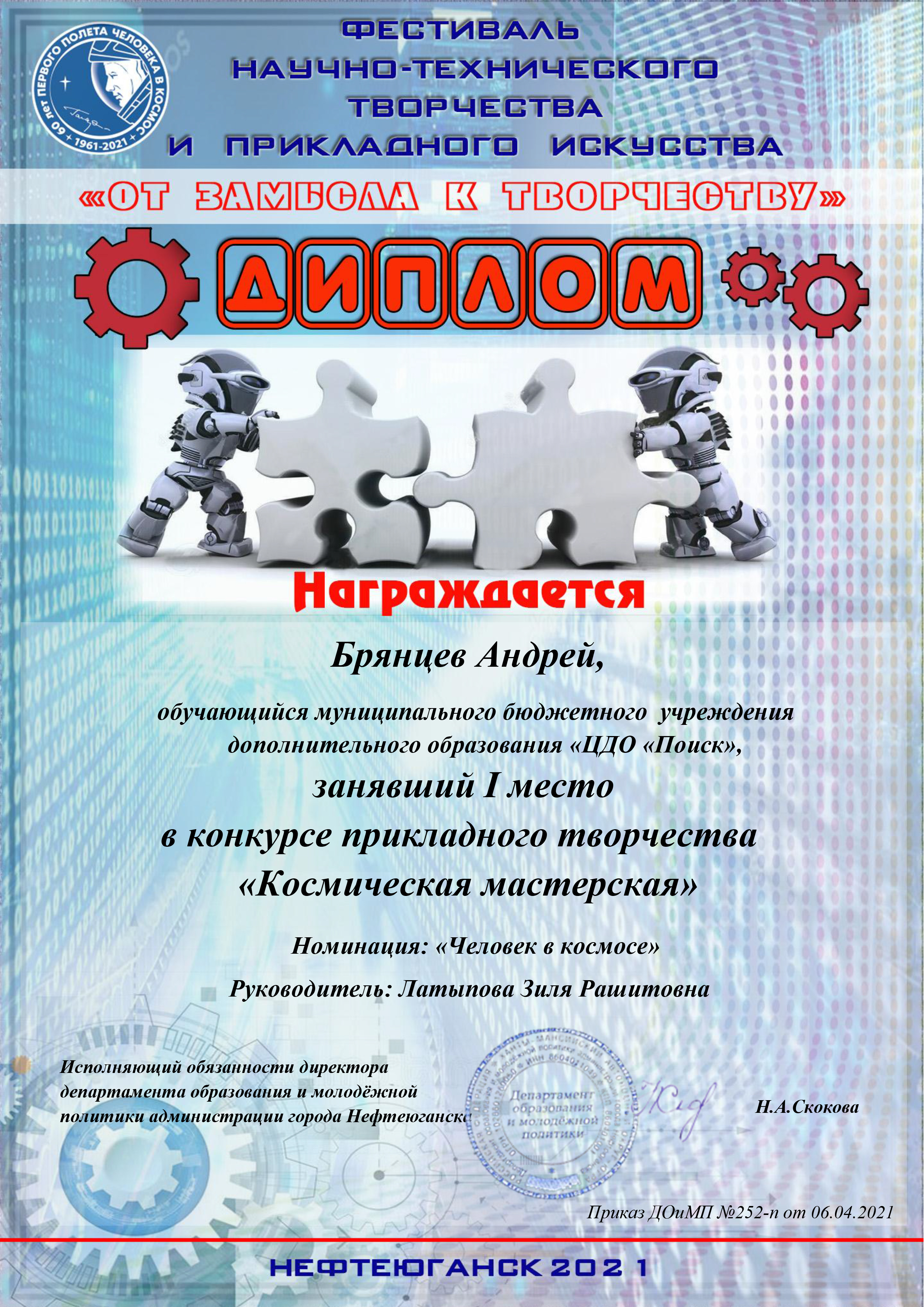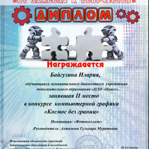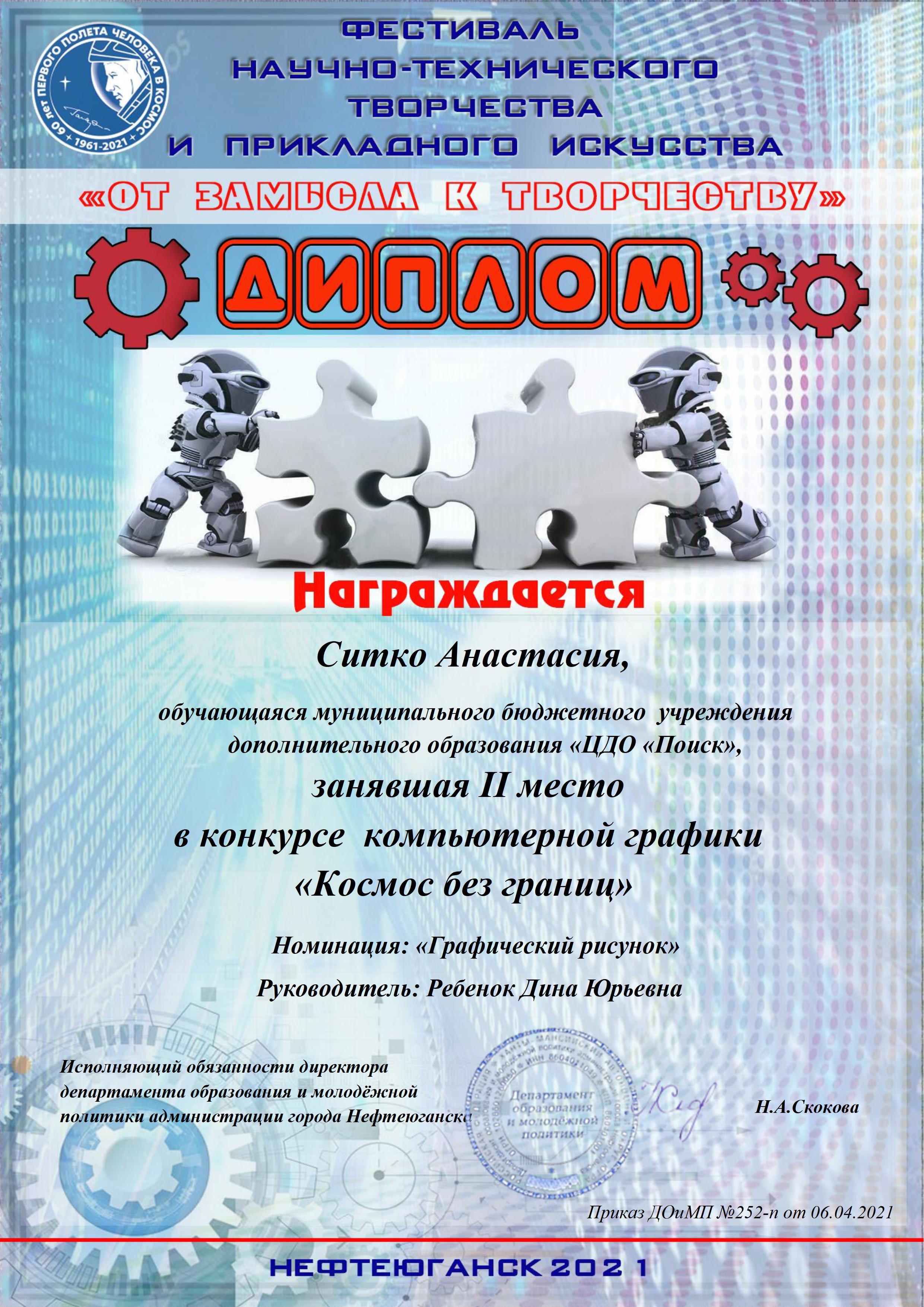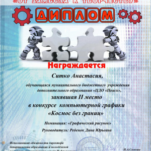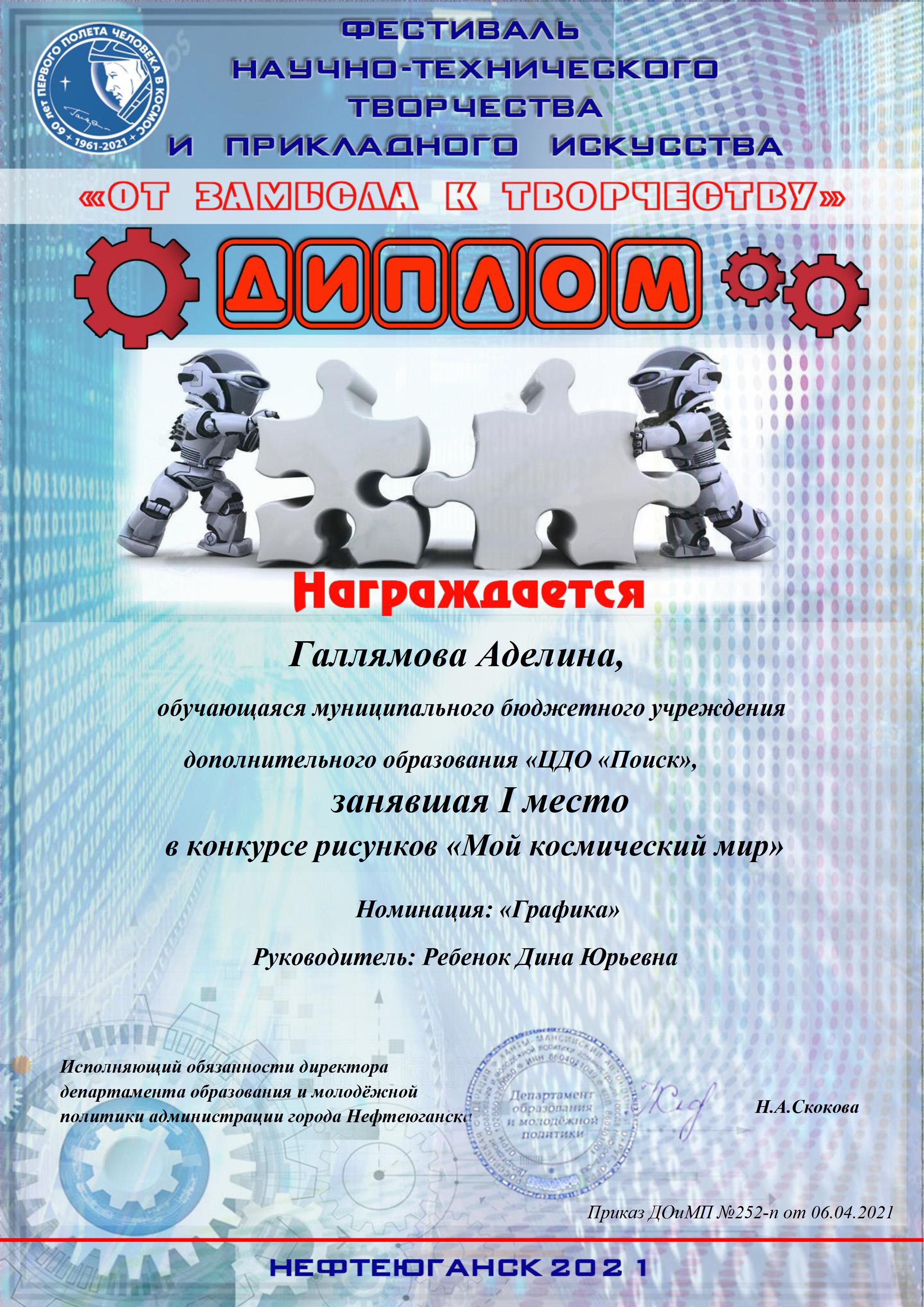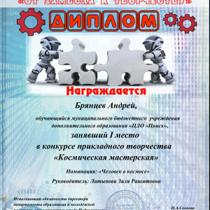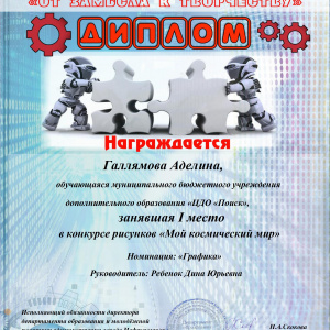 В Нефтеюганске состоялся городской научно-технический фестиваль «От замысла к творчеству», в котором принимали участие воспитанники творческих объединений Центра дополнительного образования «Поиск». Здесь ребятам представилась возможность продемонстрировать свои творческие и изобретательские способности, а также посетить мастер-классы учителей технологии, педагогов дополнительного образования. По итогам фестиваля в Доме детского творчества прошла специальная выставка работ учащихся по направления научно-технического творчества и прикладного искусства. В фестивале приняли более 10 учащихся ЦДО «Поиск» по разным направлениям. знакомьтесь, наши победители: конкурс проектных работ «Вселенная изобретателей», номинация «Дизайнерское художественное проектирование», III место, Смехнова Анна, Пальянова Мария Николаевна, педагог дополнительного образования. Конкурс рисунков «Мой космический мир , номинация Графика «Мой взгляд на космос», I место, Галямова Аделина, Ребенок Дина Юрьевна, педагог дополнительного образования. Смешанная техника. III место, «Космический журналист», Черванева Анна - Мария , Мельник Оксана Михайловна., педагог дополнительного образования. «ТОП фактов», «Интересные факты о космосе», Земцова Марина Хвесько Елизавета, Гааг Александра Абдрахманова Карина, III место, Мельник Оксана Михайловна, педагог дополнительного образования. «Человек в космосе» I место, «Сказал поехали Гагарин…» Брянцев Андрей, Латыпова Зиля Рашитовна, педагог дополнительного образования. «Человек в космосе» II место, «Человек, изменивший мир» Братцева Мария, Латыпова Зиля Рашитовна, педагог дополнительного образования. «Фотоколлаж» II место, «С мечтой о космосе» Байгузина Илария, Ахтямова Гульнара Муратовна, педагог дополнительного образования, «Фотоколлаж» III место, «Самая красивая планета Земля" Якимова Вероника, Ахтямова Гульнара Муратовна, педагог дополнительного образования. «Графический рисунок» II место, «Космические сказки. Космический создатель» Ситко Анастасия,Ребенок Дина Юрьевна, педагог дополнительного образования. Поздравляем Вас с заслуженной победой в конкурсе! Желаем не останавливаться на достигнутом, всегда двигаться вперед, покорять любые вершины. Пусть на пути к успеху Вам всегда светит счастливая звезда!