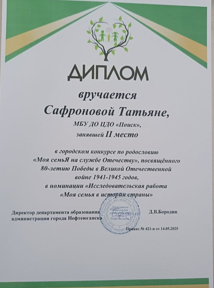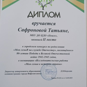 По результатам конкурса, в номинации "Исследовательская работа" "Моя семья в истории страны", Татьяна получила Диплом Призера (2 место).
