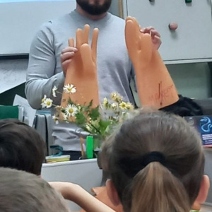 Дмитрий Романович рассказал учащимся центра, где и как делают электричество, как оно поступает в квартиры, и почему важно соблюдать правила электробезопасности как в квартире, так и на улице. Кроме того, была продемонстрирована спецодежда электромонтёров, ребята с большим удовольствием все посмотрели, а некоторые даже примерили одежду.