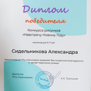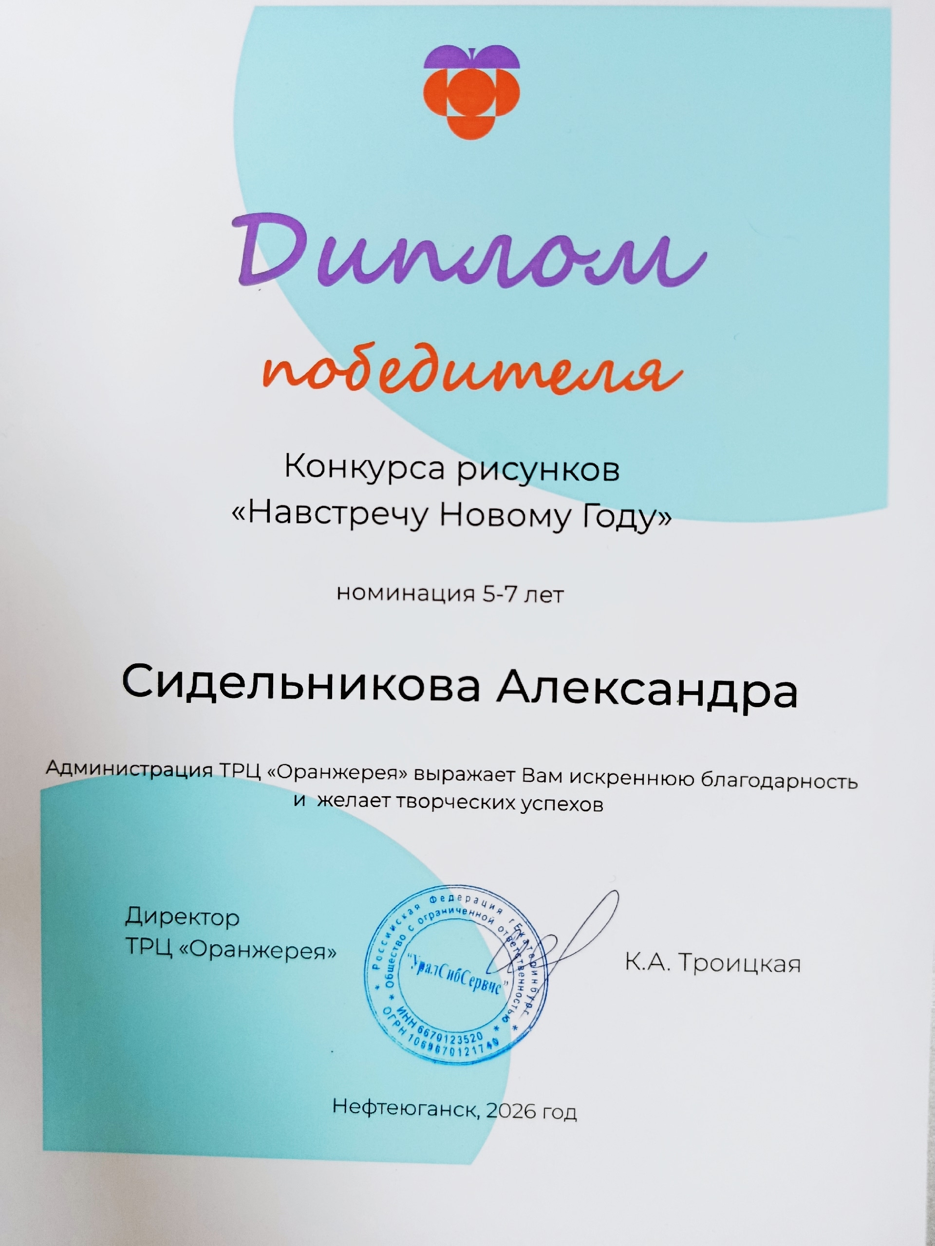 Сидельникова Александра , обучающаяся творческого объединения "АртЛесенка" центра дополнительного образования "Поиск" , стала победителем конкурса рисунков "Навстречу новому году" Ее работа покорила сердца жюри . Организатор конкурса - администрация ТРЦ "Оранжерея".Александру наградили дипломом и памятными подарками. Поздравляем Александру и Елену Борисовну Потякину с достигнутым успехомЖелаем и дальше покорять новые вершины творчества !