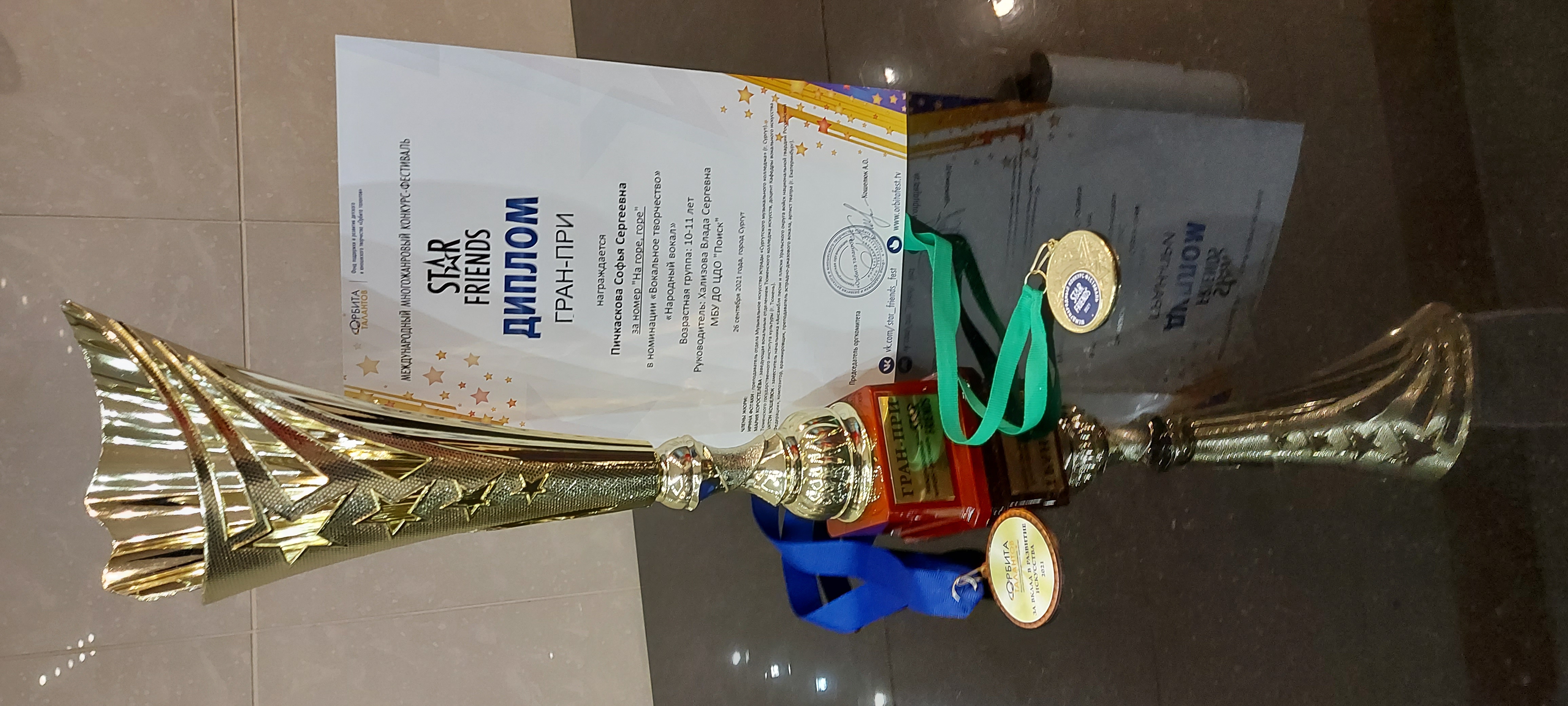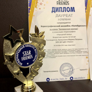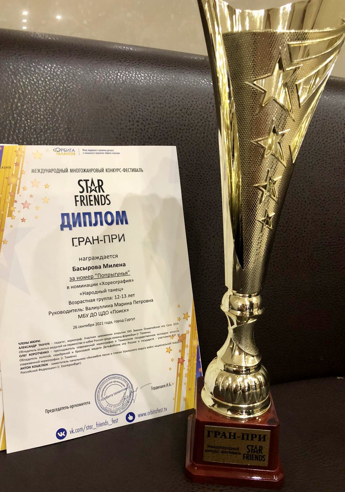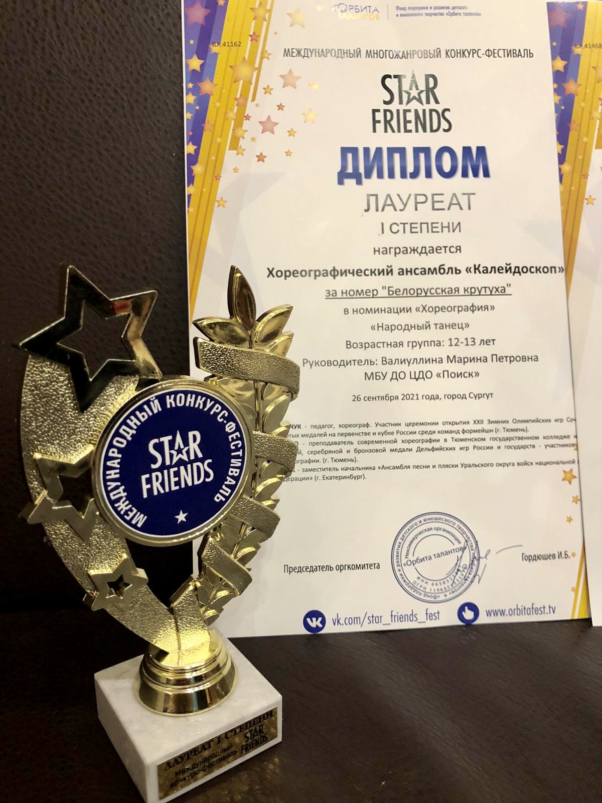 26 сентября 2021 года в городе Сургут прошел Международный многожанровый фестиваль коллективного творчества "Star FRIENDS" , который направлен на повышение художественного уровня репертуара и исполнительского мастерства участников. К участию были приглашены коллективы из России и зарубежья. Учредителем Конкурса является Продюсерский центр «Белые Крылья» при поддержке Фонда поддержки и развития детского и юношеского творчества «Орбита талантов». В конкурсе приняли участие и коллективы Центра дополнительного образования «Поиск»:хореографический ансамбль «Калейдоскоп», руководитель Марина Валиуллина, хореографический ансамбль «Надежда», руководитель Надежда Саткаева, вокальный ансамбль «Лад» руководитель Влада Хализова. По итогам фестиваля солистка ансамбля «Калейдоскоп» Басырова Милена получила Гран-При , старшая группа коллектива за танец «Белорусская крутуха» стали лауреатами I степени.