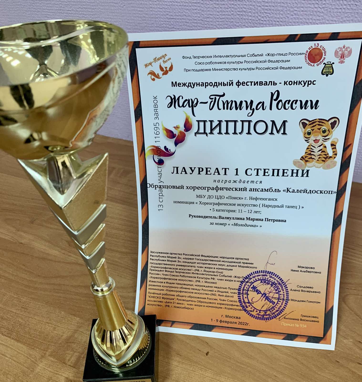 Развитие культуры народного творчества,повышение профессионального мастерства участников и руководителей творческих коллективов, выявление и поддержка талантливых детей и молодежи, эстетическое воспитание подрастающего поколения – вот главная цель Международного фестиваля – конкурса "Жар-Птица России", который с 2009 года собирает лучшие коллективы нашей страны. В состав жюри конкурса входят ведущие специалисты, деятели культуры и искусств, преподаватели творческих ВУЗов, композиторы, профессиональные артисты из Москвы, Санкт-Петербурга и других городов России. Вот, и в феврале 2022 года в Москве состоялся Международный конкурс, в которых приняли участие тысячи юных дарований из множества регионов Российской Федерации - от Брянска до Петропавловска-Камчатского, от Норильска до Сочи, а также Республик Узбекистан, Казахстан, Беларусь, Азербайджан, стран Япония, Индия. И мы рады, что образцовый хореографический ансамбль «Калейдоскоп» Центра дополнительного образования «Поиск» стал лауреатом I степени в номинации «Народный танец». За исполнение сольных номеров воспитанницы коллектива Куренкова Дарья и Басырова Милена стали лауреатами 1 степени, а Гурова Полина получила Гран – при фестиваля. Поздравляем старшую группу коллектива и их педагога Марину Петровну Валиуллину с заслуженной Победой. Гордимся вашими успехами и желаем дальнейших творческих успехов, ярких номеров, эмоциональных выступлений и бурных аплодисментов.