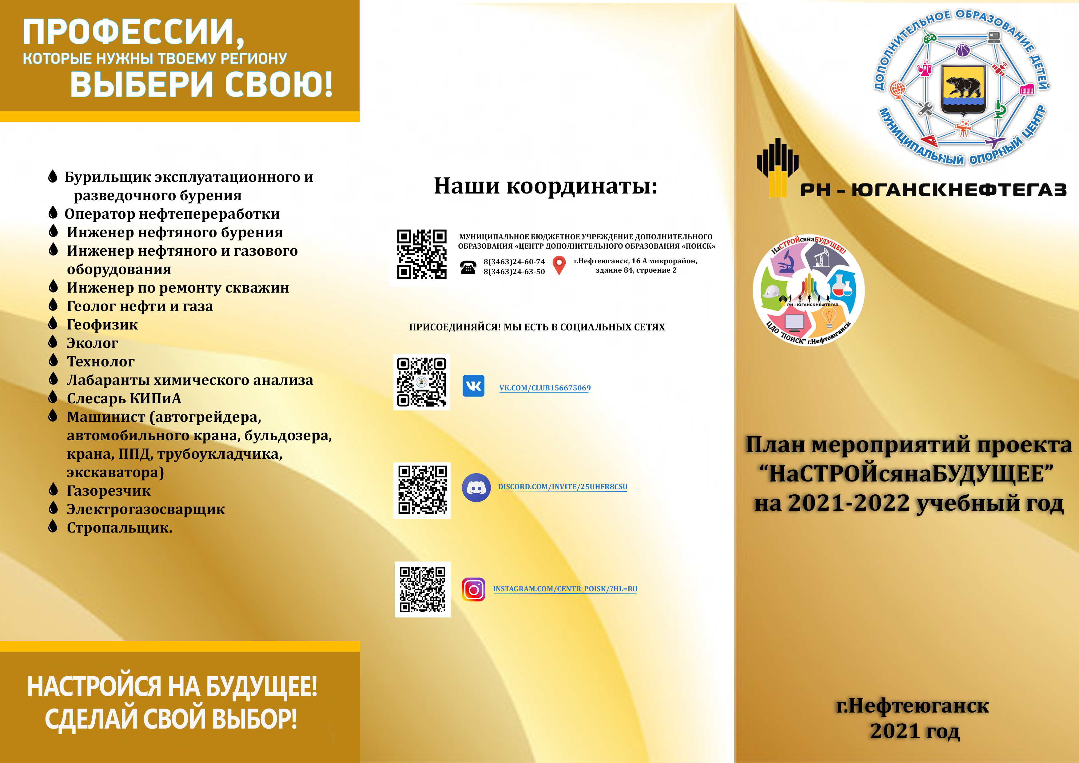 Центр дополнительного образования "Поиск" и ОО "РН-Юганскнефтегаз" 24 сентября 2021 года дали старт новому проекту "НаСТРОЙсянаБУДУЩЕЕ"!!! с целью выявления и поддержки молодежи в области подготовки кадров для нефтегазовых предприятий! В форуме приняли участие Николай Сергеевич Нестеров, главный специалист отдела молодежной политики ООО «РН-Юганскнефтегаз», Марина Николаевна Исламова,специалист – эксперт Департамента образования и молодежной политики администрации города Нефтеюганска, ведущий специалист отдела по гидроразрыву пластов Александр Посохов. О совместном плане работы ЦДО «Поиск» и ООО «РН-Юганскнефтегаз» познакомила ребят и педагогов города заместитель директора по учебно – воспитательной работе Центра дополнительного образования «Поиск» , руководитель проекта «НаСТРОЙсянаБУДУЩЕЕ» Михуля Венера Наилевна.