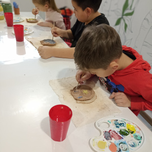 Ребята вылепили своими руками тарелочки из глины в форме кошек и сов.