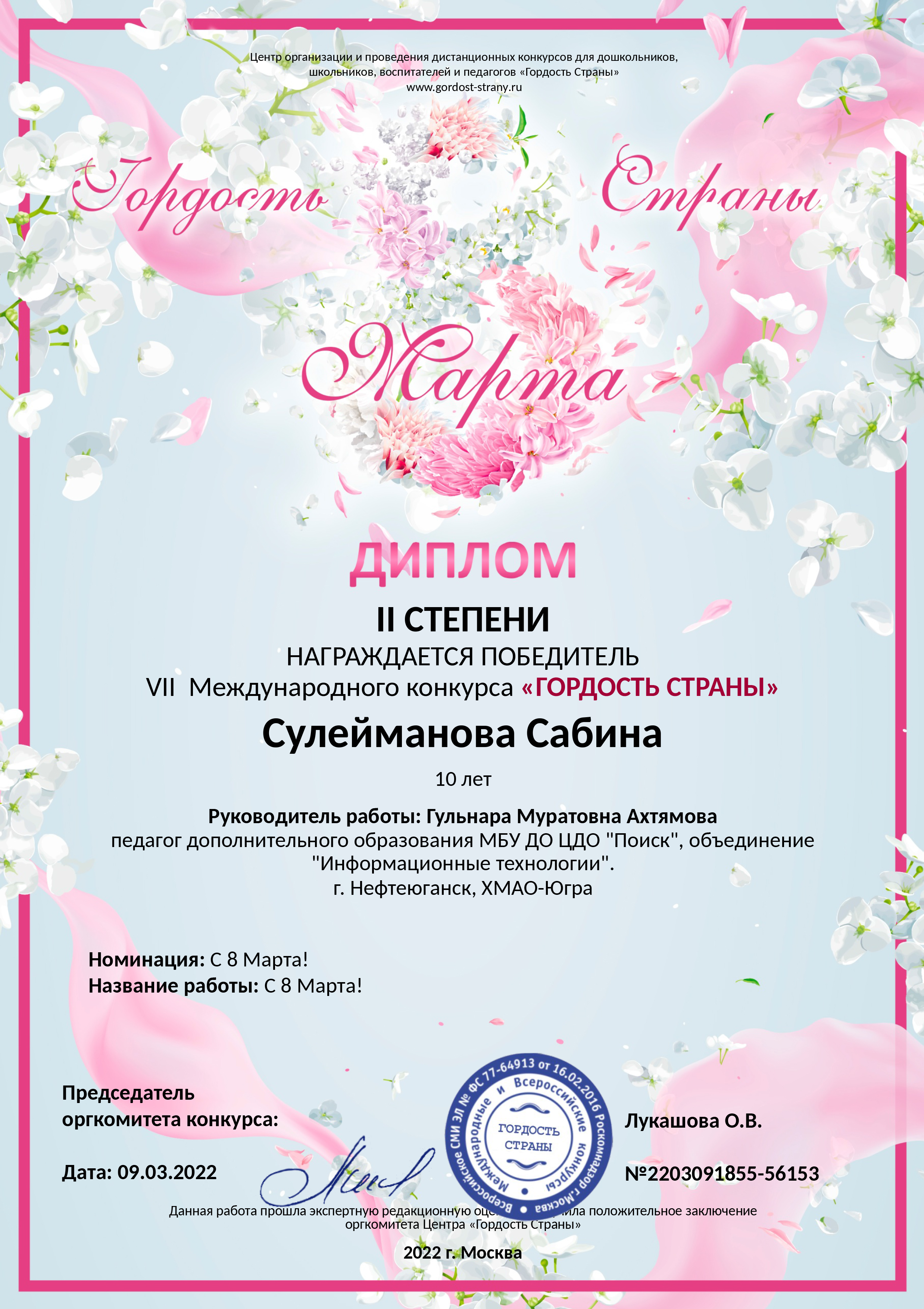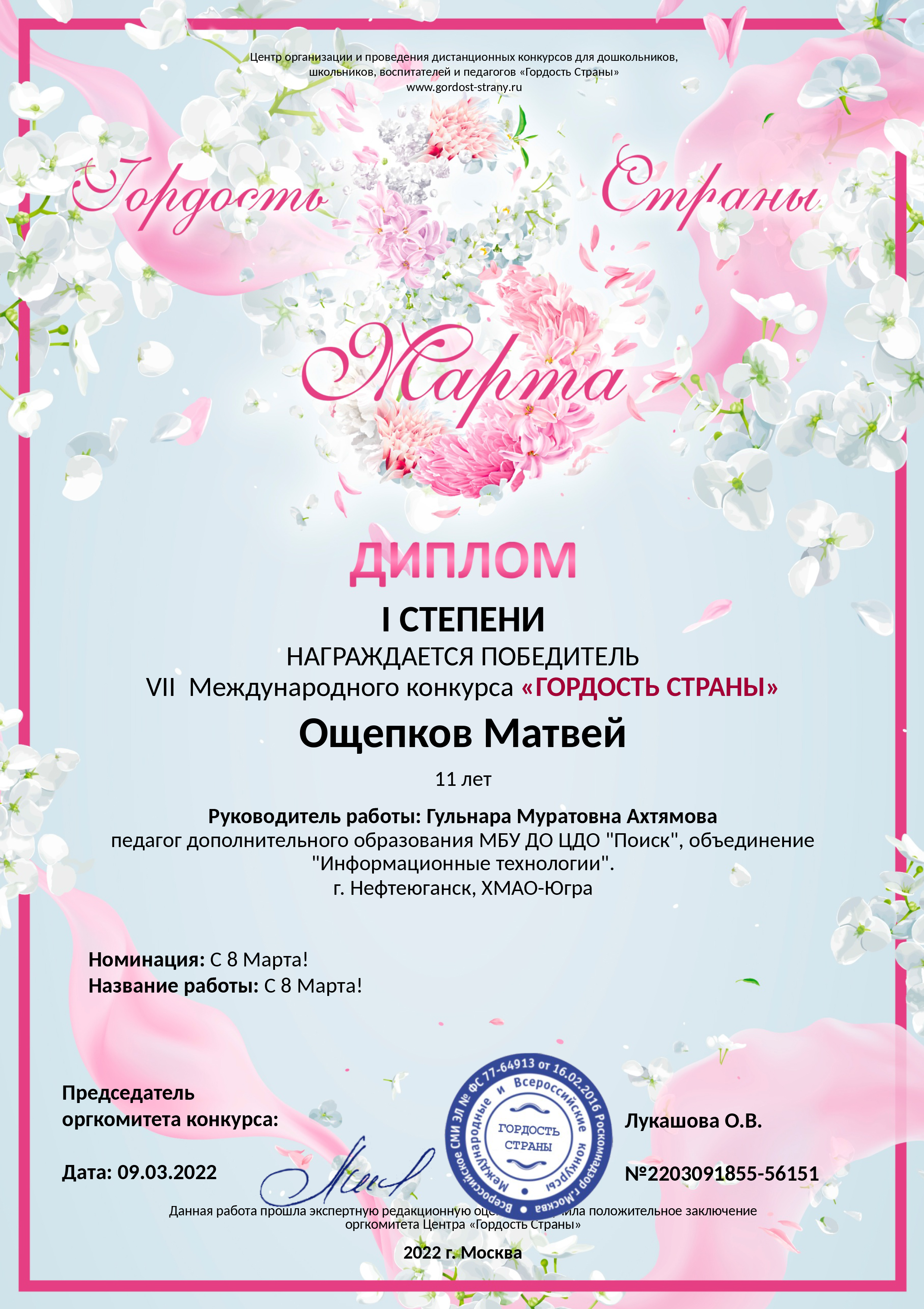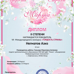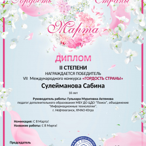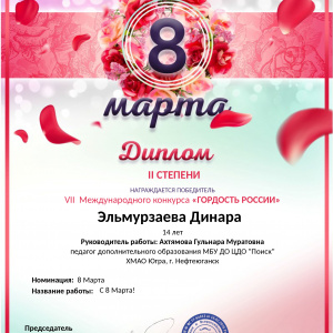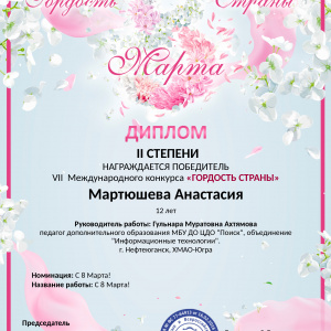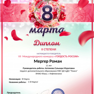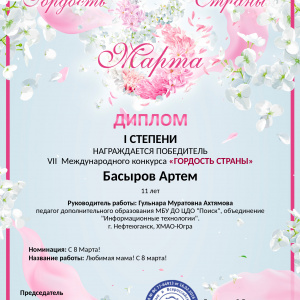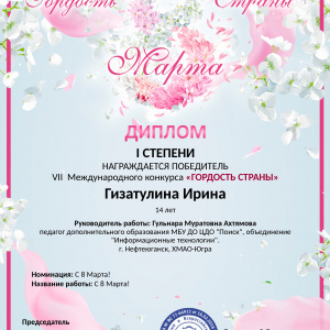 Весна.... Весна... "Ручьи поют, и солнце пригревает". 8 Марта- Международный женский день, праздник, который ежегодно отмечается во многих странах земного шара. Учащиеся объединения "Информационные технологии" приняли участие в VII Международном конкурсе "8 Марта", и стали победителями этого конкурса.