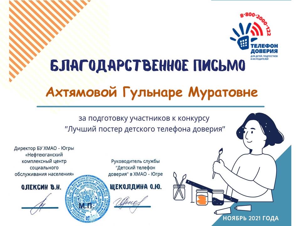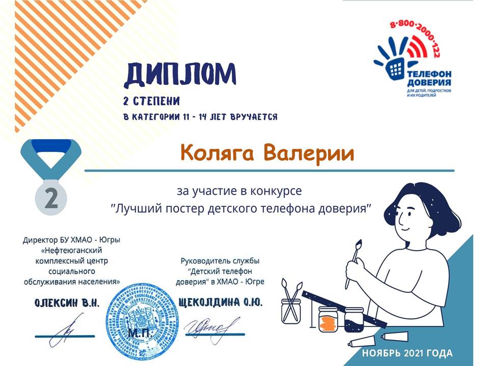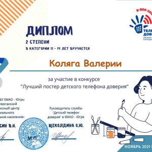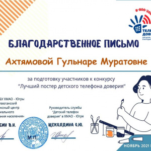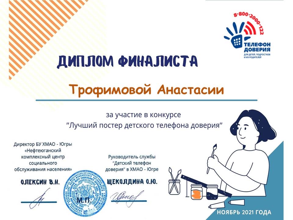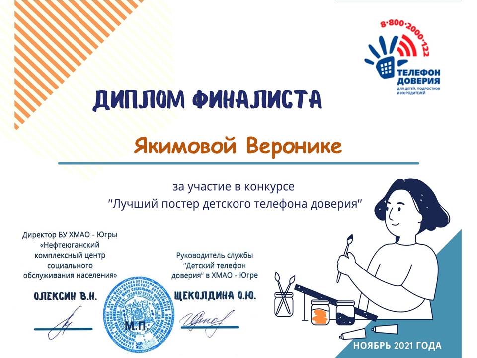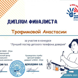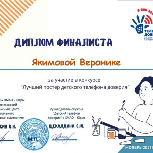 1 декабря 2021 года были подведены итоги конкурса "Лучший постер детского телефона доверия", который был организован и проведен БУ ХМАО-Югры "Нефтеюганский комплексный центр социального обслуживания населения". В конкурсе приняли участие 491 обучающийся и воспитанник образовательных учреждений округа. 55 работ вышли в финал. И только самые лучшие заняли призовые места. Учащиеся объединения "Информационные технологии" приняли участие в этом конкурсе, стали победителями и финалистами. В категории 11-14 лет - победителем конкурса стала Коляга Валерия - 2 место. Финалистами конкурса стали - Трофимова Анастасия и Якимова Вероника. Кроме этого, оргкомитетом конкурса было принято решение объявить номинацию "Приз зрительских симпатий". В ней лучшей стала Коляга Валерия. Поздравляем победителей!!!!!