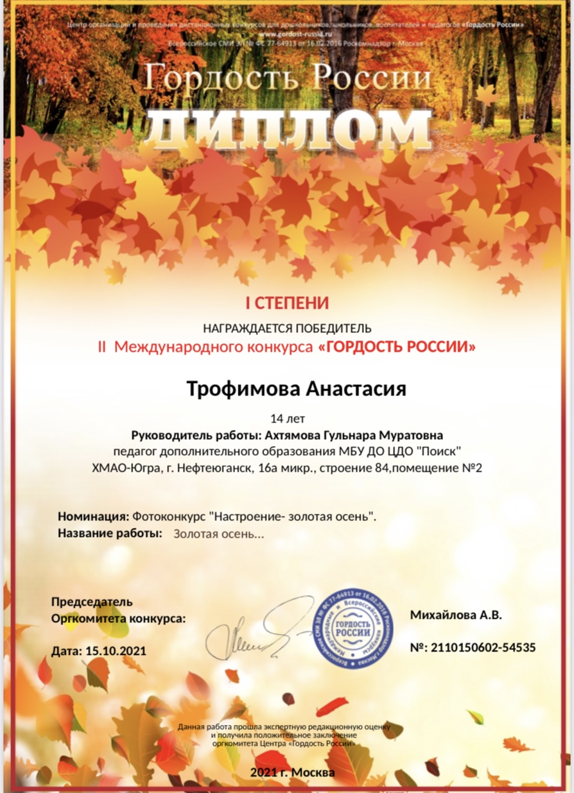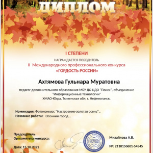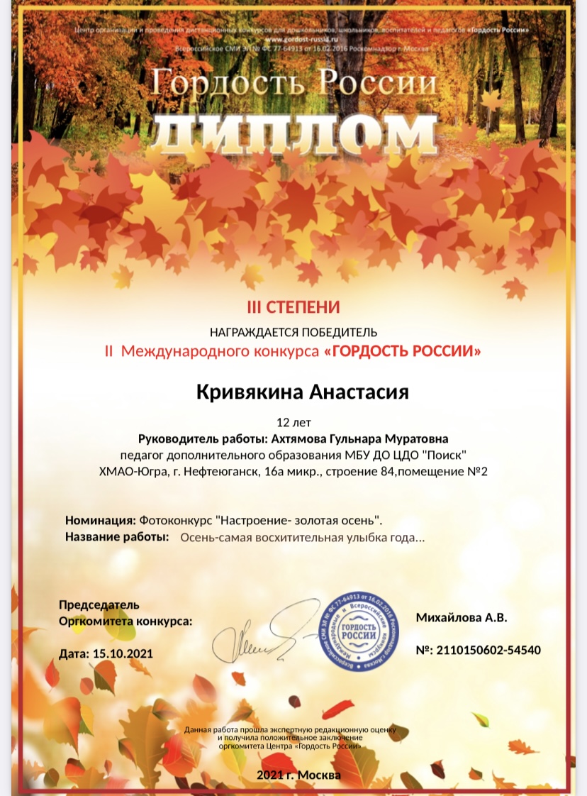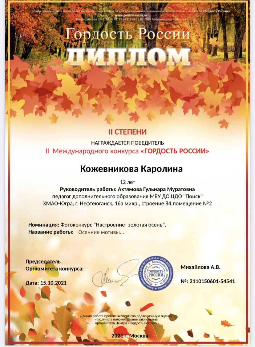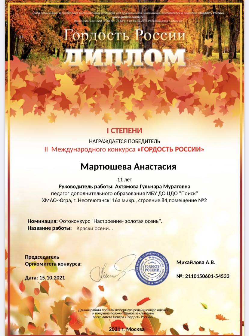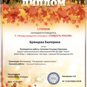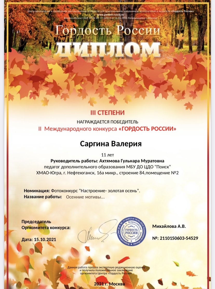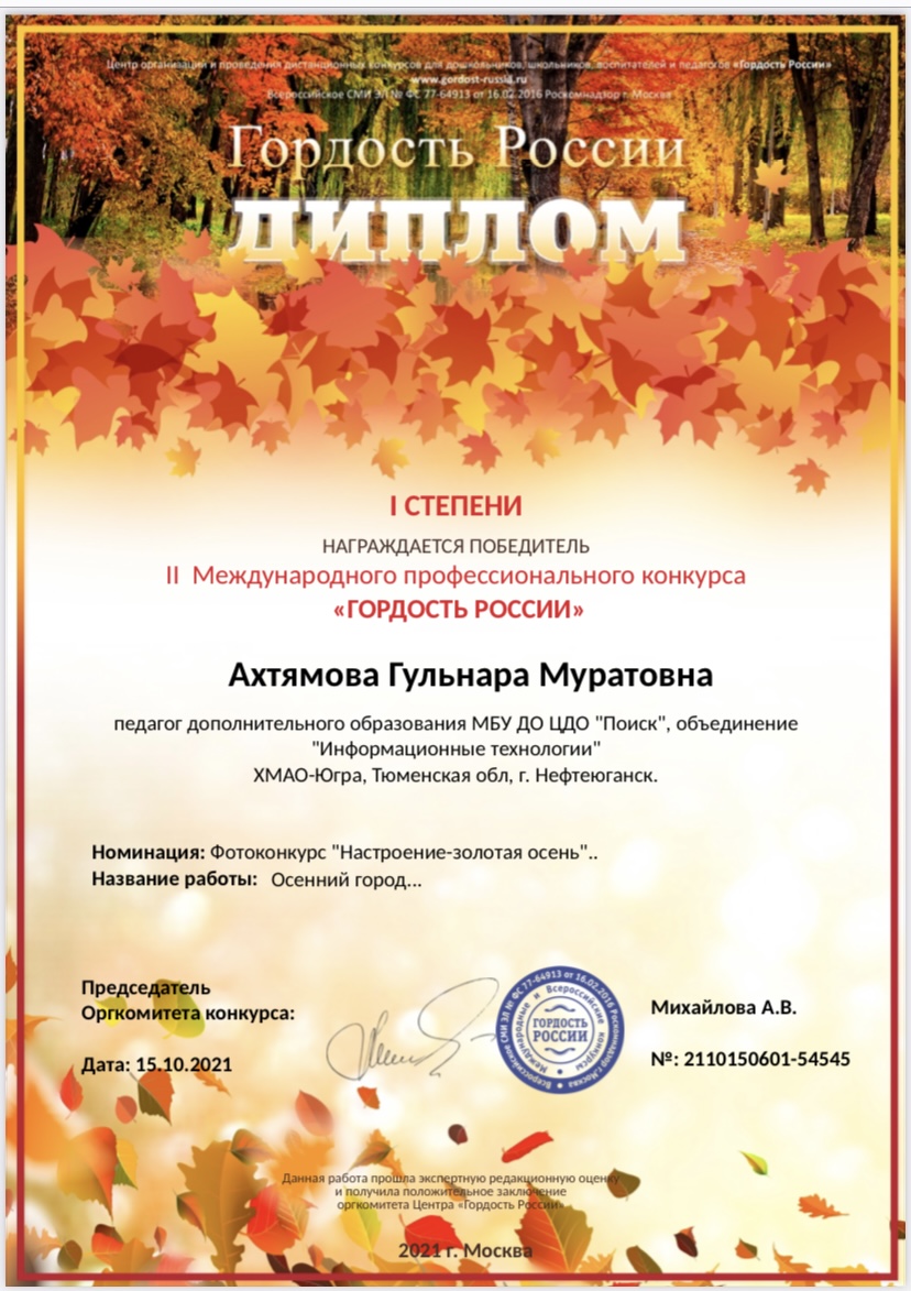 Учащиеся объединения «Информационные технологии» Центра дополнительного образования «Поиск» приняли участие в II Международном конкурсе «Гордость России», г. Москва в номинации: Фотоколлаж «Настроение-золотая осень», стали победителями. (12 дипломов победителей). Используя средства графических редакторов ребята отразили в своих работах красоту и многообразие природы г. Нефтеюганска, её богатство, уникальность и очарование. Поздравляем победителей!