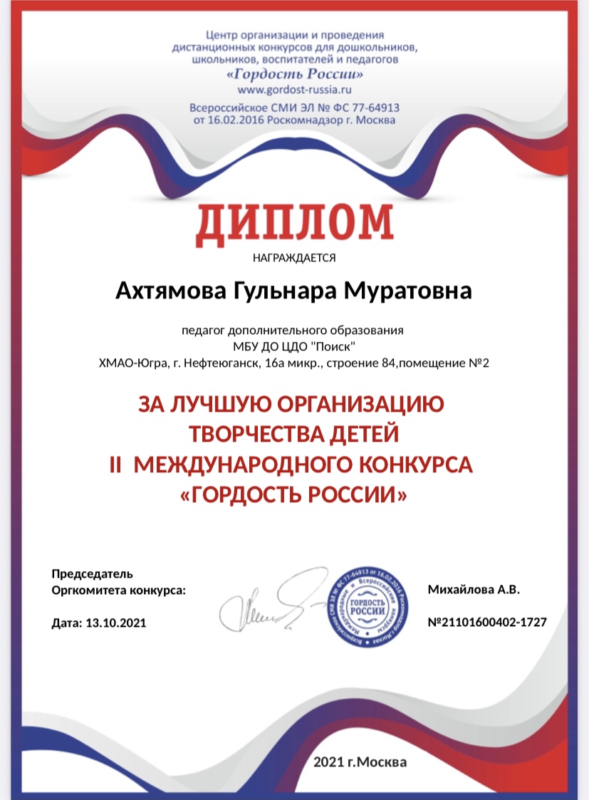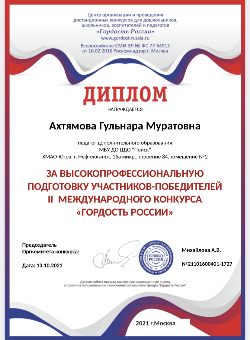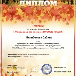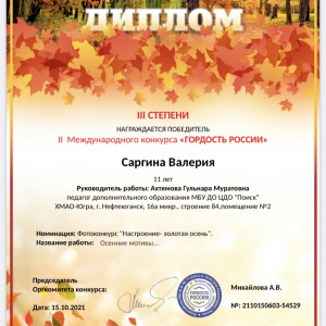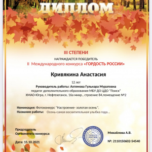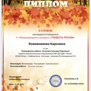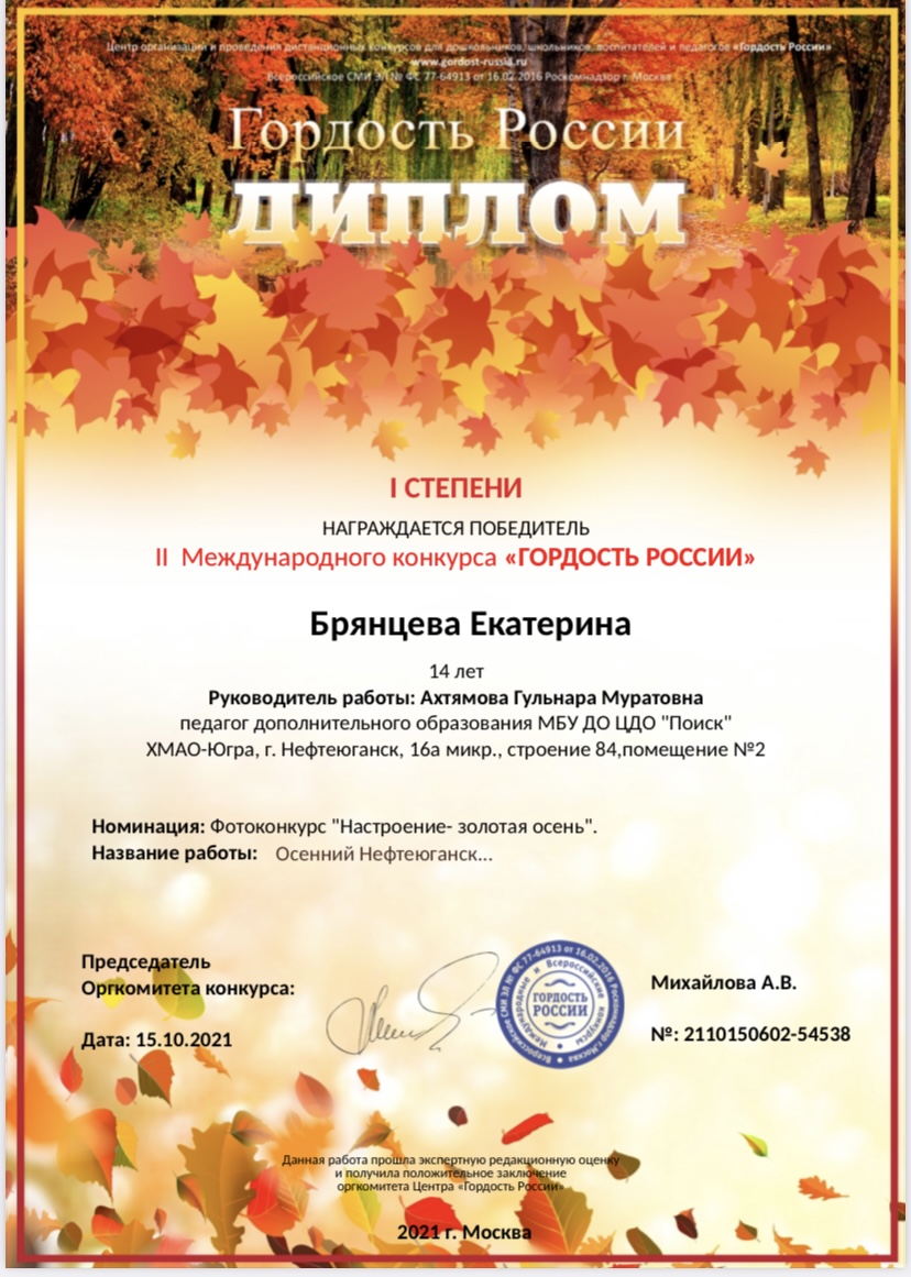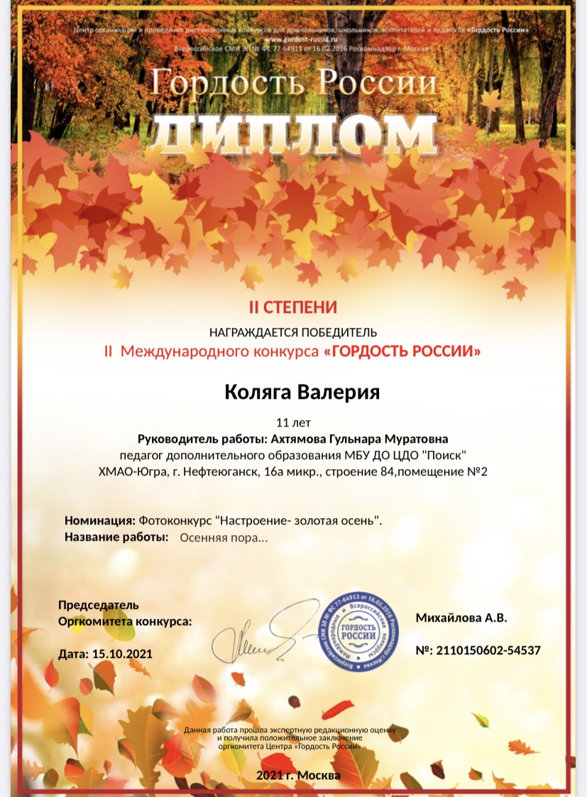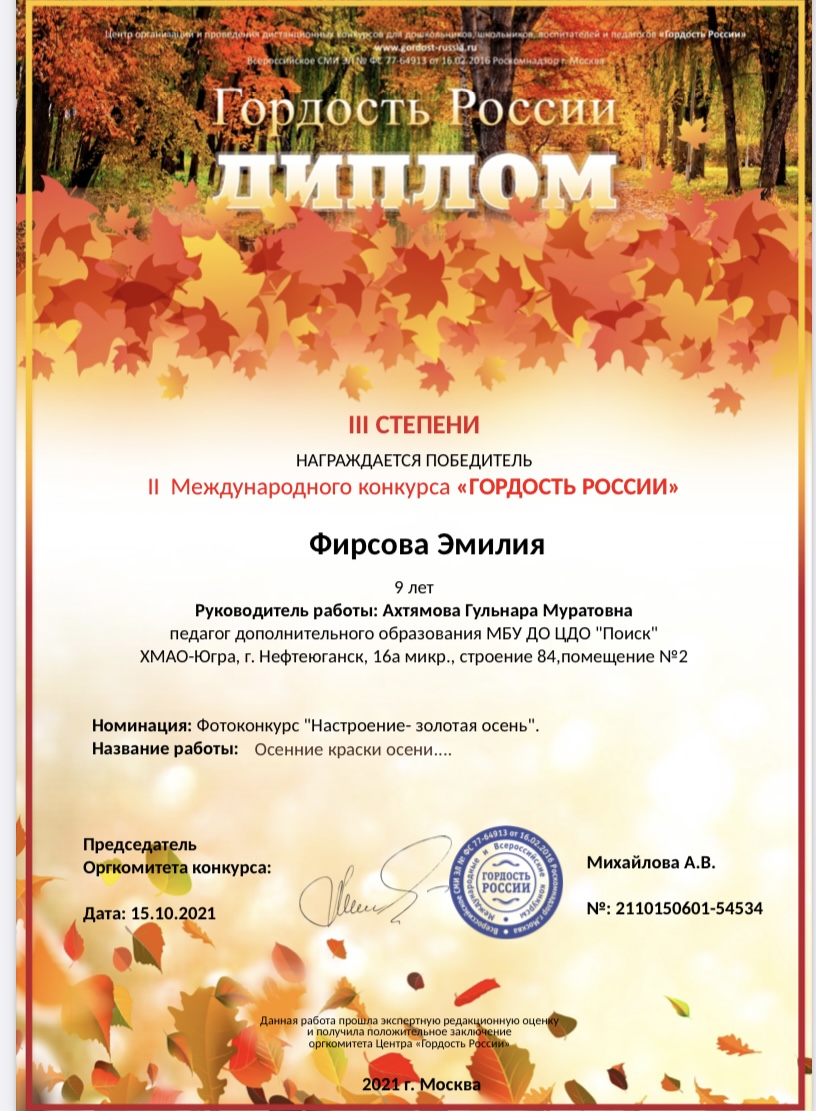 Учащиеся объединения «Информационные технологии» Центра дополнительного образования «Поиск» приняли участие в II Международном конкурсе «Гордость России», г. Москва в номинации: Фотоколлаж «Настроение-золотая осень», стали победителями. (12 дипломов победителей). Используя средства графических редакторов ребята отразили в своих работах красоту и многообразие природы г. Нефтеюганска, её богатство, уникальность и очарование. Поздравляем победителей!