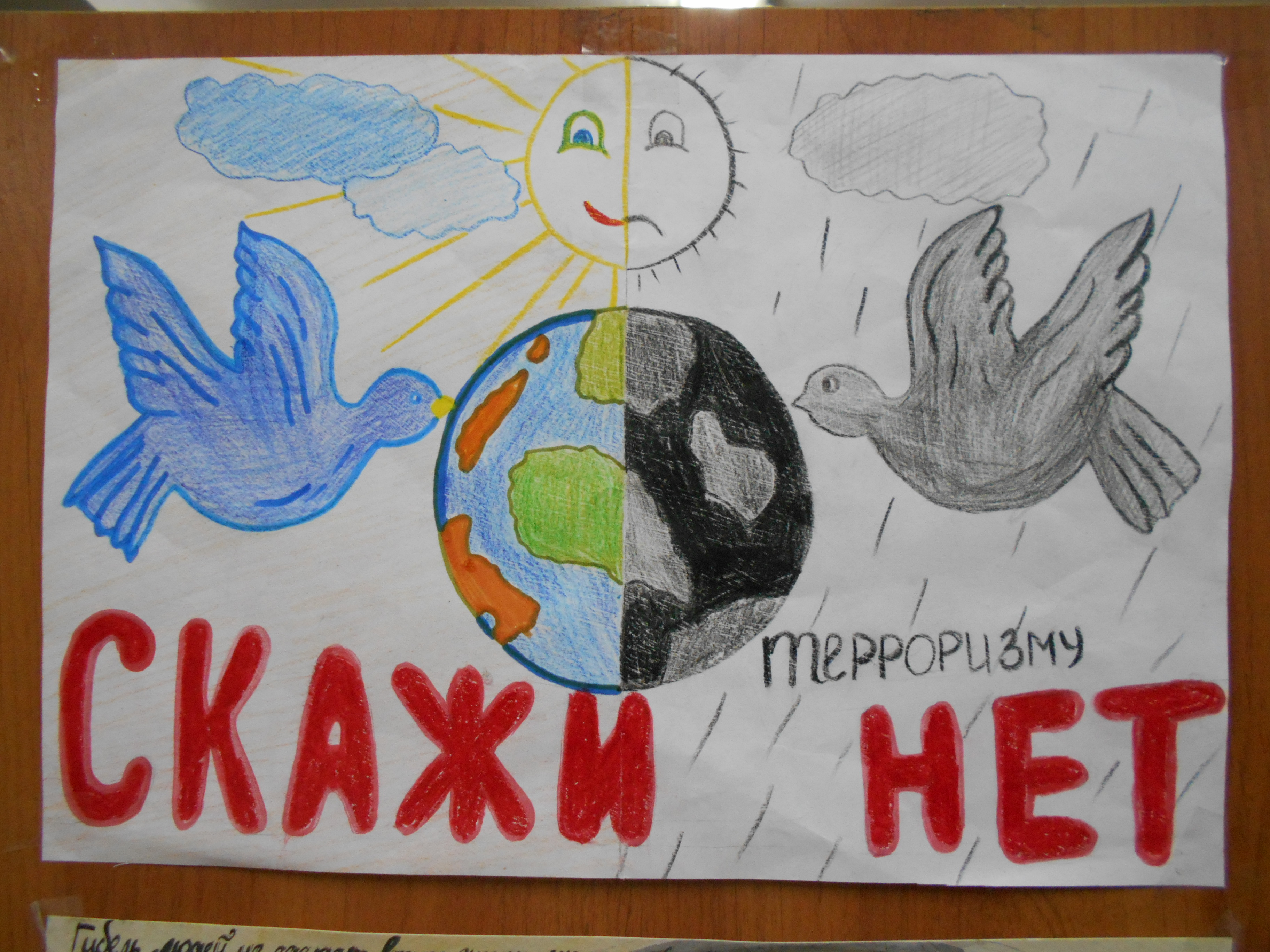 Терроризм – это преступление против человечества. В своих рисунках юные художники отразили свое отношение к терроризму, сопоставили образы мирной жизни и террористической угрозы. Ребята внесли свой маленький вклад в борьбу за мир во всем мире и выразили имеющиеся знания через изобразительное искусство.