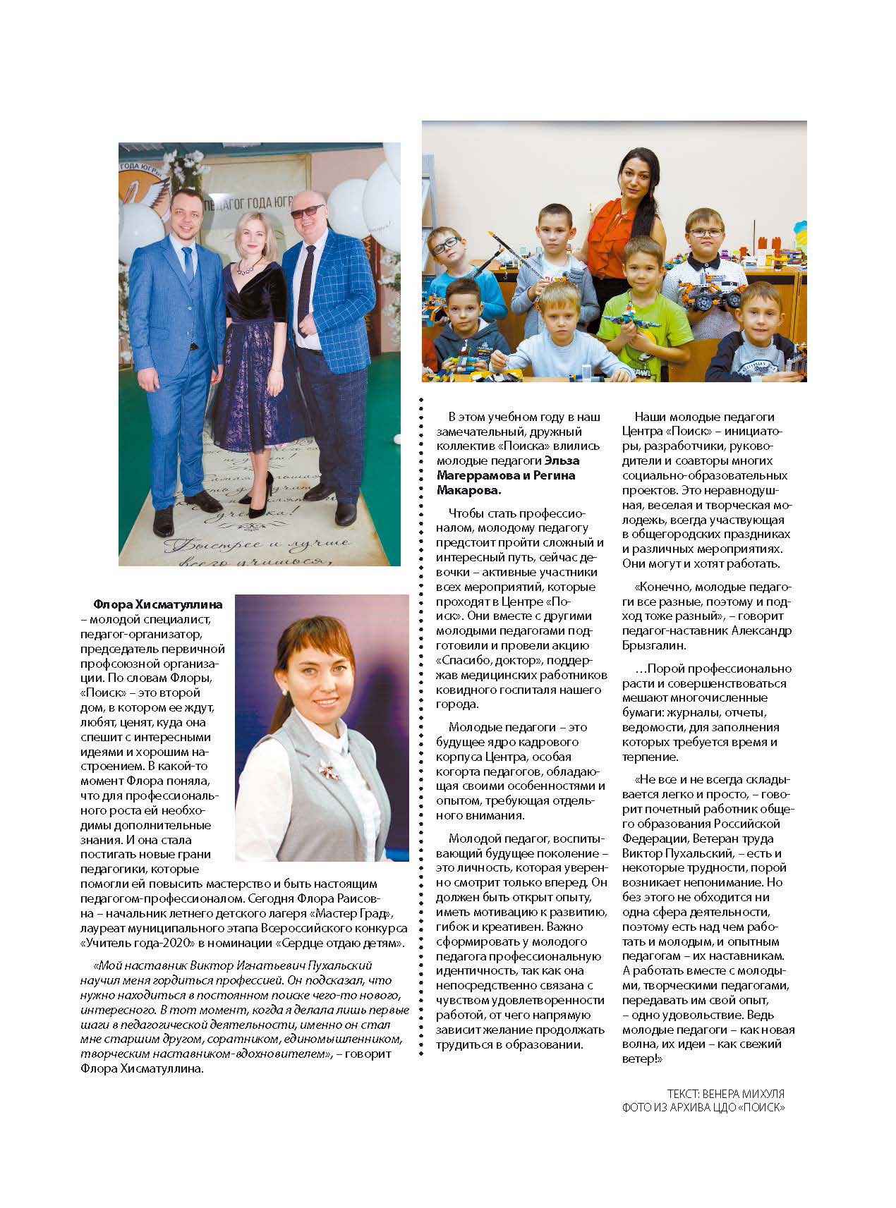 В Центре дополнительного образования "Поиск" 8 молодых специалистов. У каждого из них своя история становления и приобретения педагогического мастерства. И у каждого есть старшие коллеги-наставники, которые ежедневно, кропотливо, порой совсем незаметно для других, ведут работу по становлению молодых специалистов как педагогов-профессионалов, мастеров своего дела.