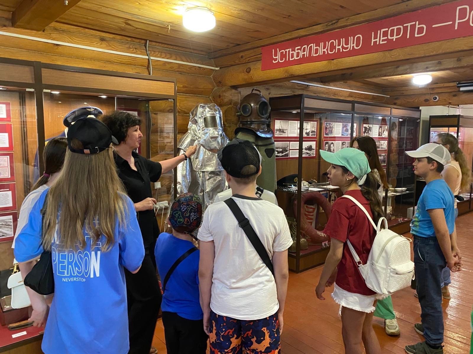 В музее нам рассказывали про нефть , что из неё состоит , как её добывают и какая она бывает. Дальше нам показали два старинных костюма водолаза и пожарного и рассказали насколько было сложно работать людям в данных костюмах.