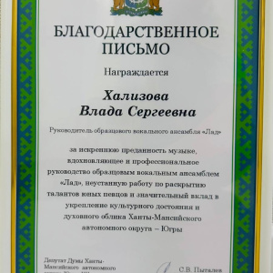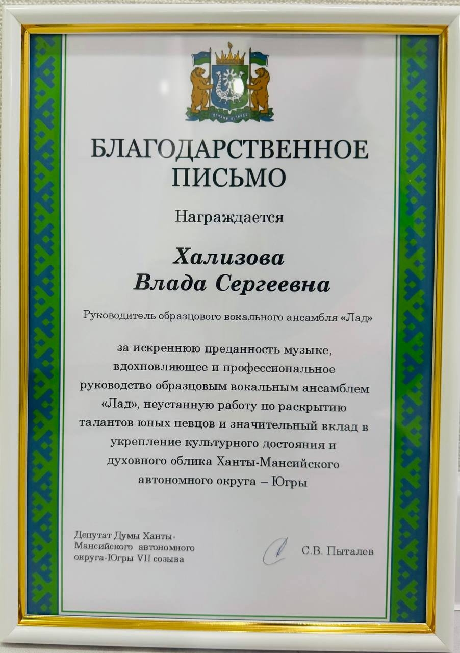 Владе Сергеевне было вручено благодарственное письмо от депутата Думы ХМАО-Югры 7 созыва, С.В. Пыталева, в знак признания её преданности музыке, вдохновляющего и профессионального руководства ансамблем "Лад", а также неустанного труда по раскрытию талантов молодых вокалистов и существенного вклада в культурное и духовное развитие ХМАО-Югры.
