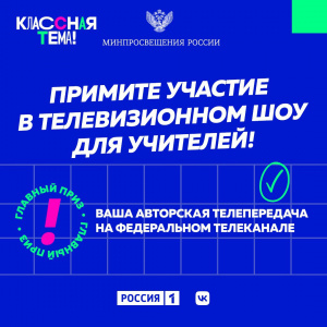 Министерство просвещения Российской Федерации и телеканал «Россия» при поддержке VK объявляют о старте Всероссийского отбора участников для нового шоу «Классная тема». *Проект, посвящённый современным учителям, запускается по поручению Президента Российской Федерации Владимира Путина и призван представить самых ярких современных педагогов и поднять престиж важнейшей профессии будущего. Победитель получит главный приз - авторскую программу на федеральном телеканале.*