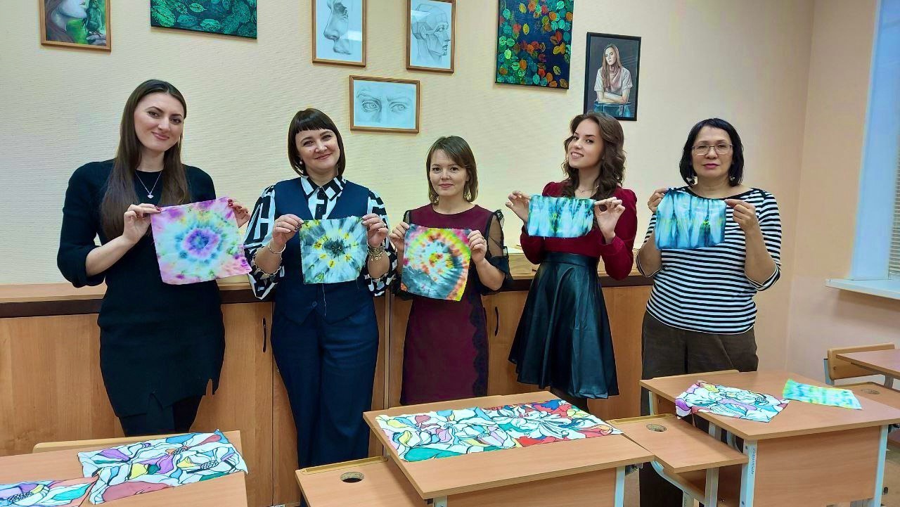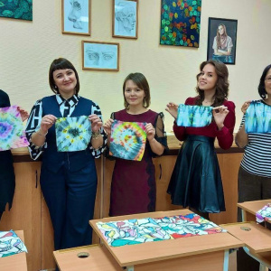 Точилова Светлана Александровна продемонстрировала способ окрашивания ткани в технике «Тай-Дай».Педагоги познакомились с различными методами скручивания ткани: