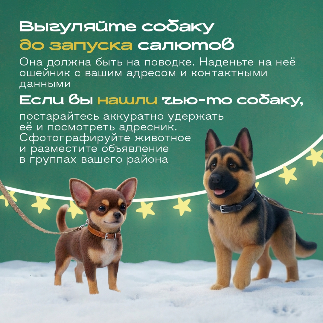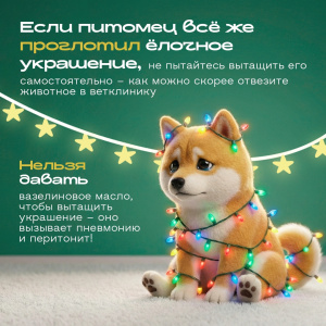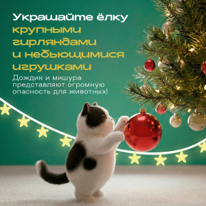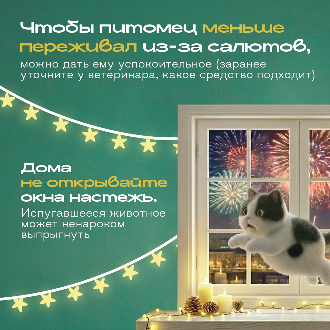 Новый год – это не только про веселье и уют, но и про потенциальную опасность для домашних животных. Салюты, резкие звуки и свет могут напугать их, а проглоченное ёлочное украшение – обернуться трагедией. Узнайте в карточках, как сделать праздник безопасным для маленьких друзей.