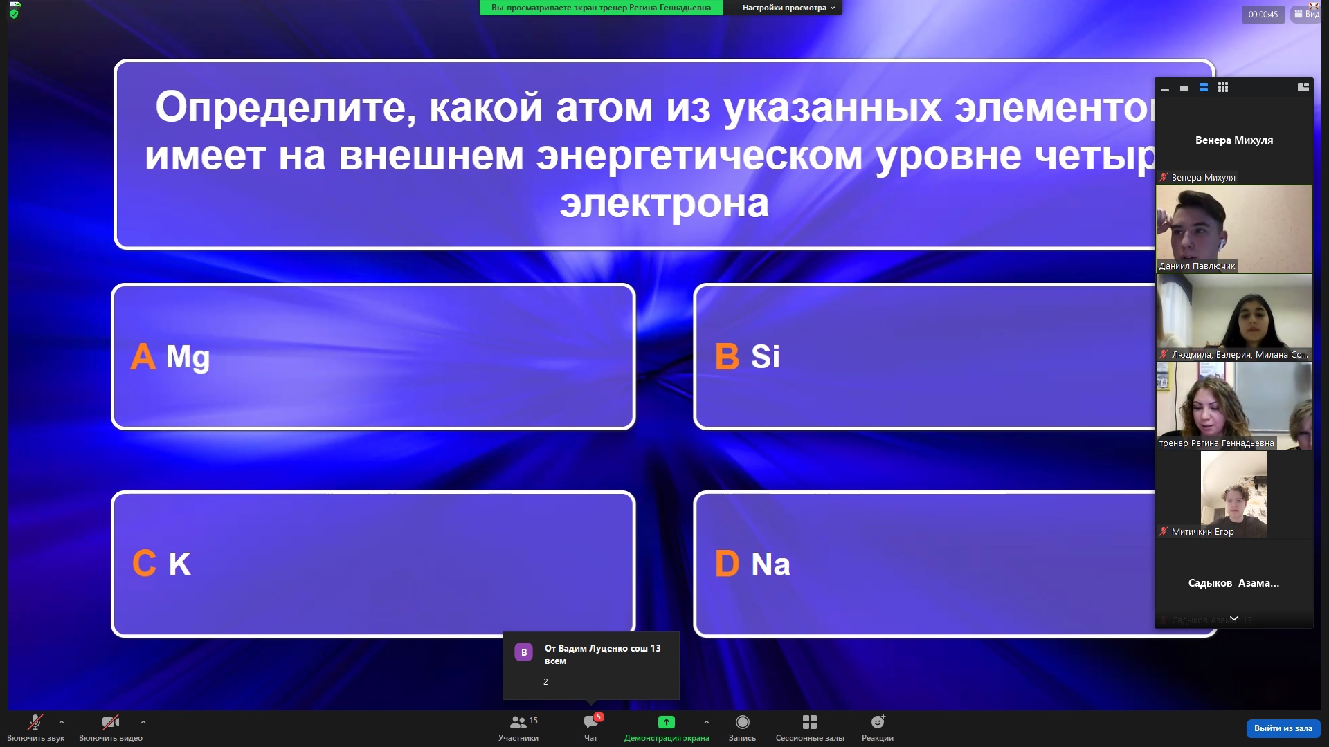 На PROF-площадке с тренером - Региной Макаровой ребята решали кейсы по химии, отметили, что задания достаточно сложные и требуют погружения в тему. Но... справились!!!! Наши участники - сила!!!