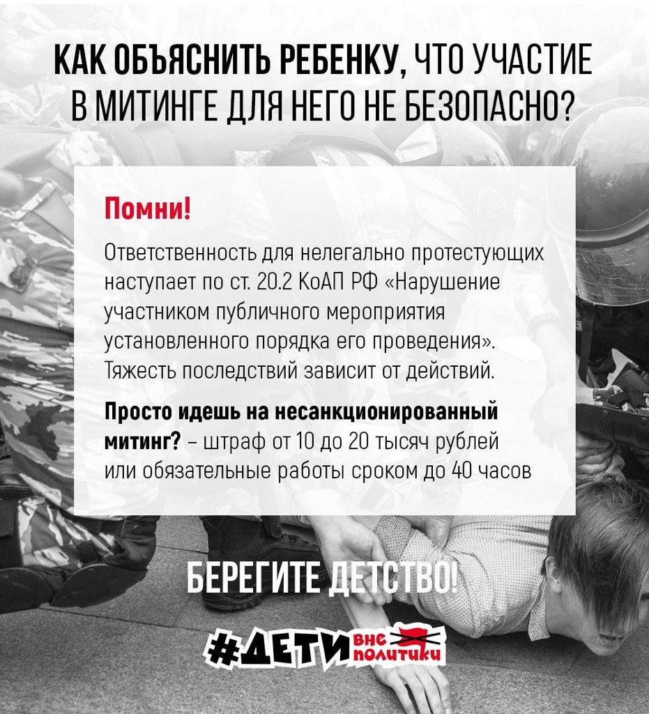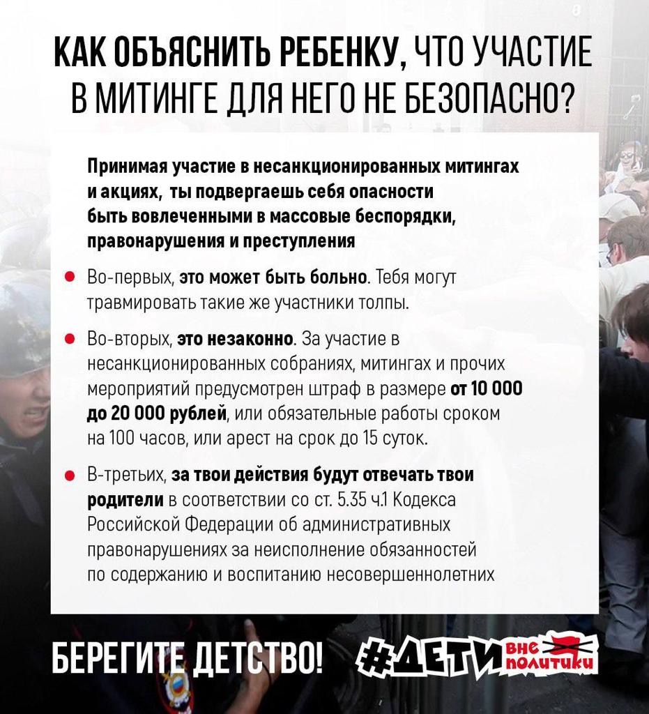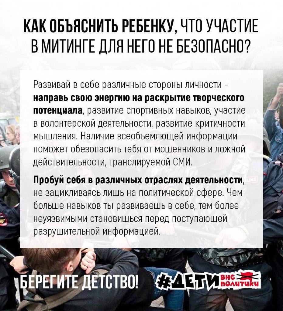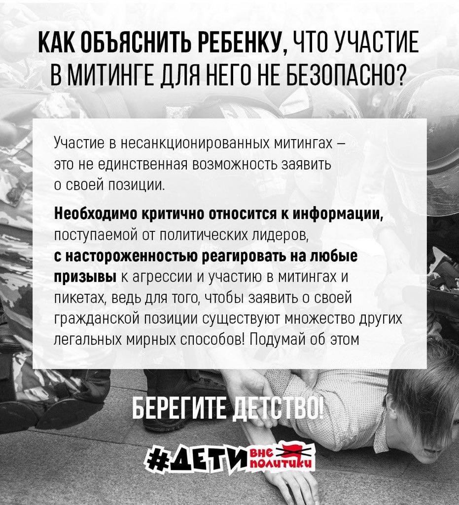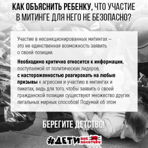 В настоящее время зафиксирована массовая рассылка среди детей в возрасте от 12 до 17 лет с призывом выйти на митинги.