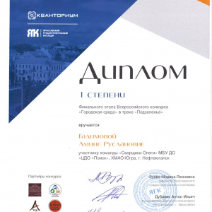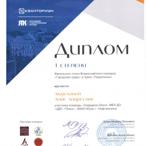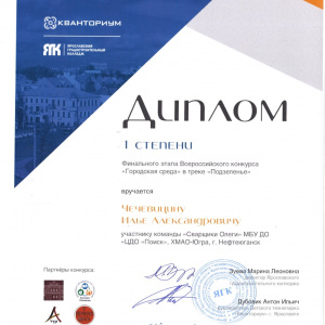 Команда дизайнеров "Сварщики Олеги" (Чечевицин Илья, Абдулина Анна, Галимова Амина) под руководством педагога Пальяновой М.Н. весной 2021 года приняла участие во Всероссийском конкурсе "Городская среда". Конкурс проходил в два этапа. На первом этапе, проходившем 12-25 февраля 2021 года, команде необходимо было разработать благоустройство малого музейного двора в г. Ярославе. Проект команды вошел в 20 лучших проектов, что явилось пропуском во второй этап конкурса.Второй этап состоялся 19-22 апреля 2021 года. Здесь команде "Сварщики Олеги" выпало задание на разработку интерактивного объекта для парка "Подзеленье" г. Ярославля. Команда достойно защитила свой проект и получила диплом 1 степени. Поздравляем победителей!