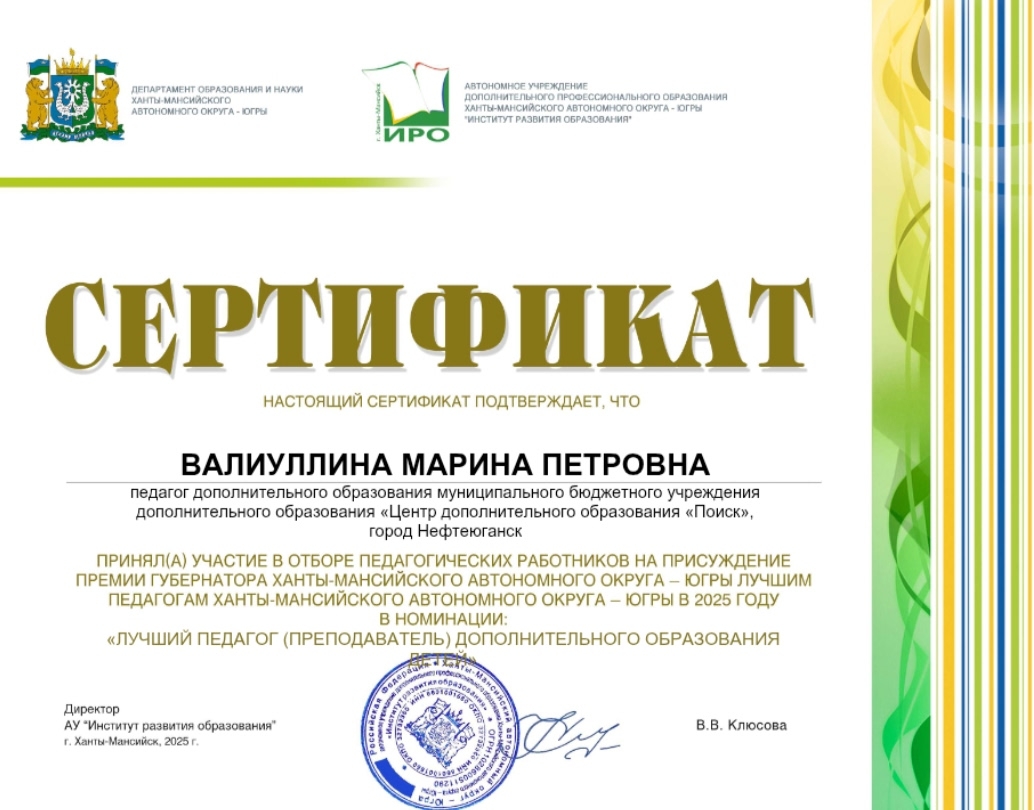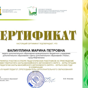 Валиуллина Марина Петровна , педагог дополнительного образования центра "Поиск", приняла участие в отборе педагогических работников на присуждение премии Губернатора ХМАО-Югры лучшим педагогам округа в 2025 году в номинации "Лучший педагог дополнительного образования" .