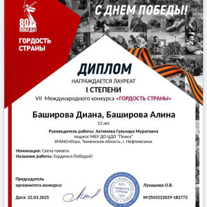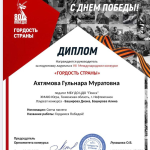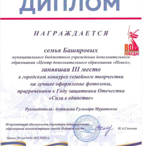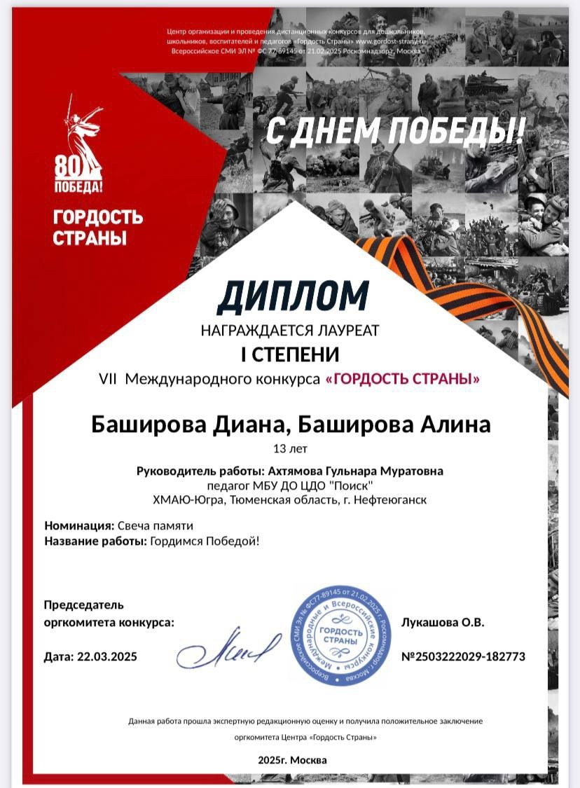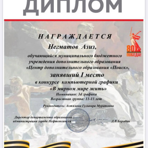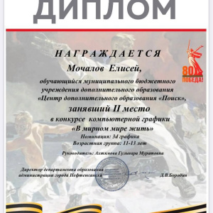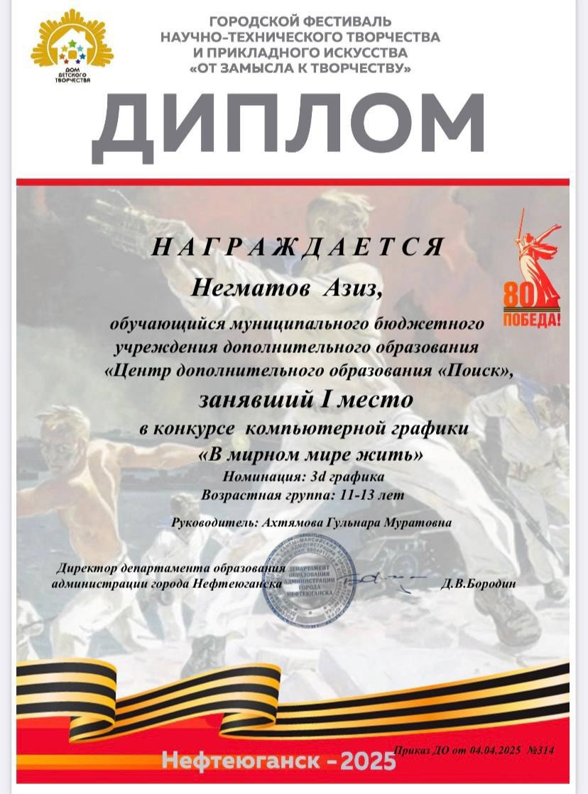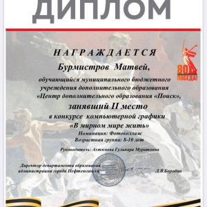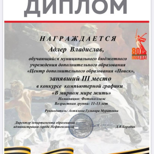 Учащиеся творческого объединения "Информационные технологии" ( руководитель Ахтямова Г. М.) стали победителями и призёрами городском конкурсе "В мирном мире жить " и конкурсе на оформление лучшей фотозоны городского фестиваля научно - технического творчества и прикладного искусства " От замысла к творчеству " .